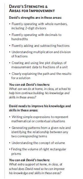 It would be even worse, however, if that list of strengths and areas for improvements were tied directly to David and based only on his performance on the one or two items on the test that measure multiplication and division of fractions, understanding of the concept of volume, or the use of line plot displays. A student’s performance on a small number of items on a single test may suggest a particular strength or weakness, but by itself is certainly not sufficient to support the claims implied by the statements on the Family Report.