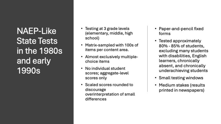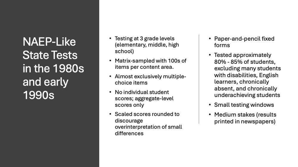 As stated above, the dawn of equating in state test can be linked to the shift from NRT to standards-based tests that began in the mid-to late 1980s and took hold in the early 1990s. What are some of the key characteristics of those early NAEP-like state tests that are relevant to equating?