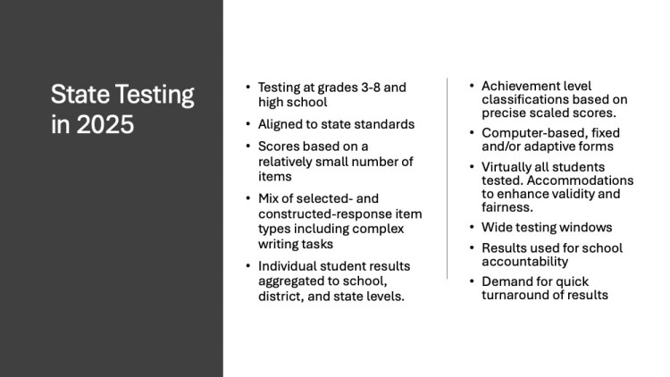 It’s certainly possible that with regard to end-of-year state tests we will see something of a retrenchment, a U-turn if you will, in which state tests in 2030 “look” more like their 1990 ancestors in terms of a decrease in the number of grade levels tested, less focus on individual student scores, and an increase in the use of matrix sampling increasing the pool of items available for equating.