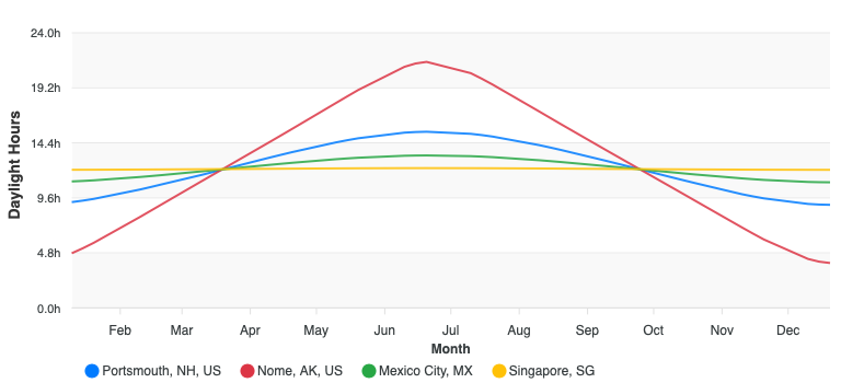 A colleague in Nome, Alaska would be looking at a range from approximately 4 to 21 hours, while one in Mexico City would only experience only a 2-hour shift. And what of our friends living in Singapore, Bogatá, Nairobi, Pontianak, or Quito. I’m betting that not even the geekiest of quants living in one of those cities on the equator would spend even one of the 365 days in the year thinking about hours of daylight. For as we know, interest, information, insight, and beauty come from variation.
