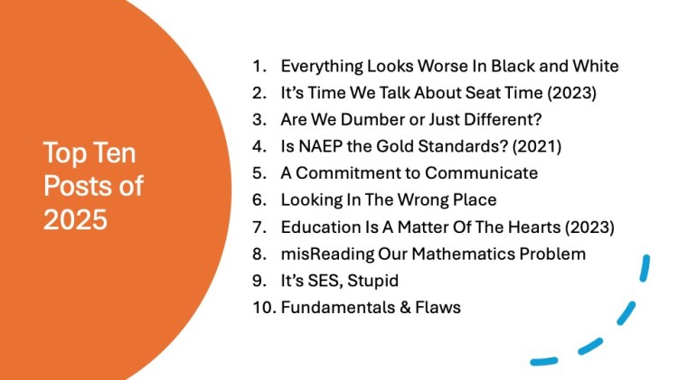 I was not surprised that 5 of the top 10 most popular posts of 2025 (including 3 of the top 4) were related directly or indirectly to NAEP, specifically to US students’ continuing struggle to perform well on the NAEP tests. Even at the height of NAEP performance in the early 2010s, the percentage of students meeting NAEP proficiency and college-ready benchmarks was too low to be acceptable.