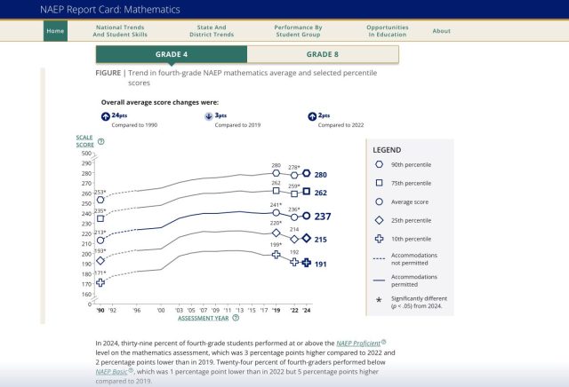 Then around a decade ago things started to change. With the 2017 NAEP administration we began to see the results for higher and lower performing students moving in opposite directions. Notwithstanding the pandemic blip in 2022, that trend continued in 2024 – and we know how NAEP loves its trends.