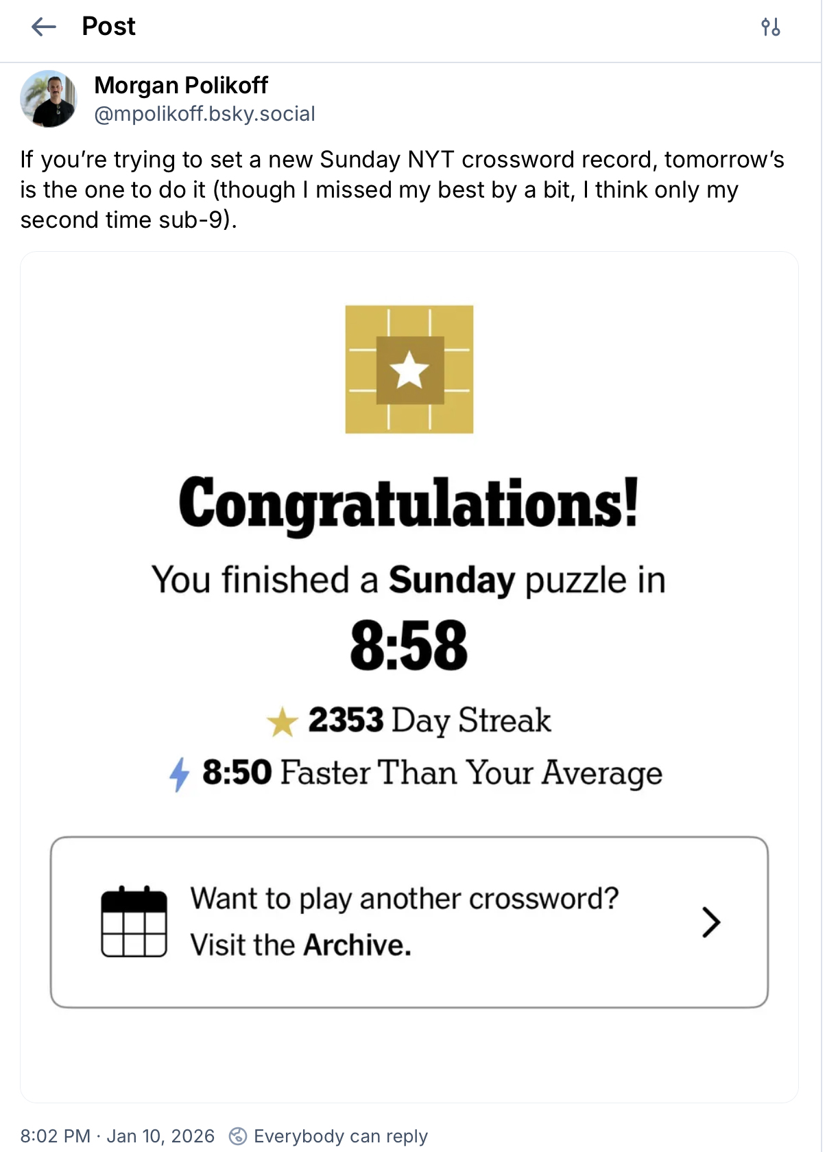 I could have been discouraged, but context is critical. I know that Morgan is an outlier, residing in the rarefied air of the thin end of the curve in just about everything he does, including posting on BlueSky. Why would solving the Crossword be any different?